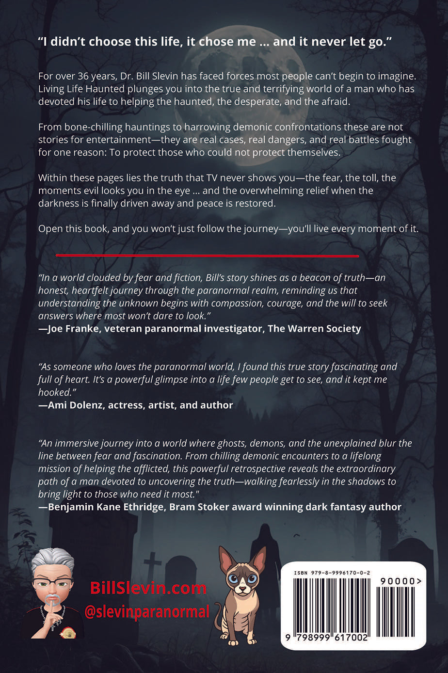 Living Life Haunted is the true account of Dr. Bill Slevin, a famous paranormal investigator and demonologist who has more than thirty years of experience in the paranormal. A veteran of thousands of investigations. Dr. Slevin takes readers deep into the shadows of a life forever tied to the paranormal.